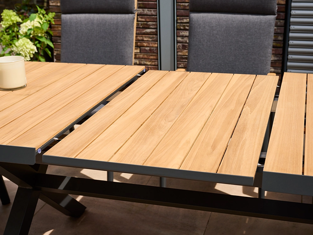 Die Wahl des Materials für Deinen Ausziehtisch ist entscheidend, um die Haltbarkeit und Pflegeleichtigkeit zu gewährleisten. Ausziehtische aus Holz, wie Teakholz, sind besonders beliebt, da sie sowohl robust als auch ästhetisch ansprechend sind. Teakholz ist bekannt für seine Widerstandsfähigkeit gegenüber Witterungseinflüssen und behält über Jahre hinweg seine Schönheit. Auch Ausziehtische aus Keramik oder HPL bieten eine moderne Optik und sind zudem pflegeleicht und strapazierfähig. Diese Materialien sind besonders für den Außenbereich geeignet, da sie unempfindlich gegenüber Regen und Sonne sind.