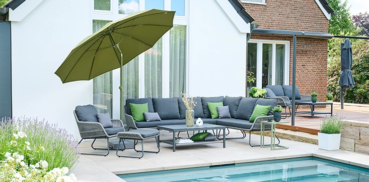 Klares Design und funktionale Details – PAOLO ist die perfekte Ergänzung für stilvolle Terrassen und Gärten. Das robuste Gestell aus pulverbeschichtetem Aluminium sorgt für Stabilität und moderne Eleganz. Der hochwertige Bezug in dezenten Farben schafft ein harmonisches Ambiente und ist gleichzeitig witterungsbeständig sowie langlebig.